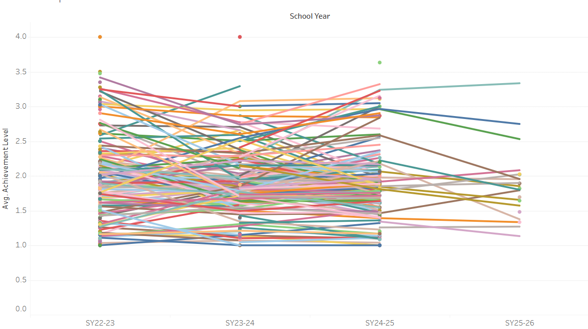This approach transformed raw, multi-year assessment data into an executive-friendly tool that supported exploration, comparison, and data-informed decision-making at the district level.