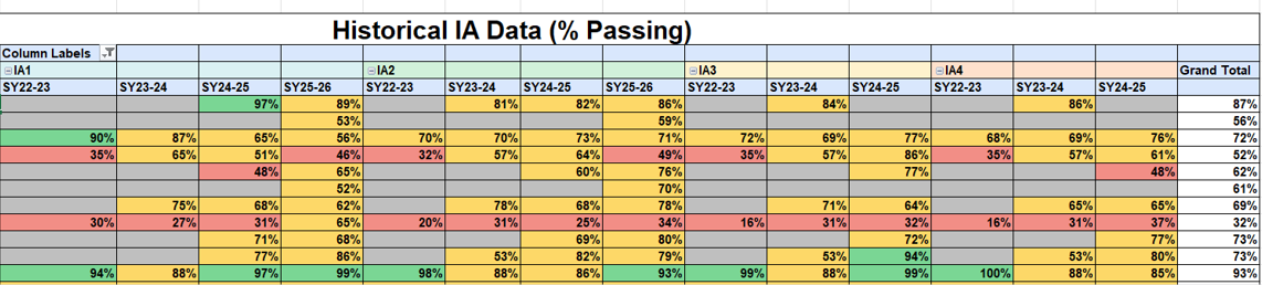 The IA dashboard was designed to capture short-cycle instructional trends within and across school years. With multiple assessment points per year, this view allows leadership to see how teacher performance shifts over time in response to instruction, pacing, and intervention.